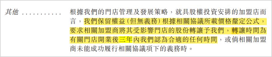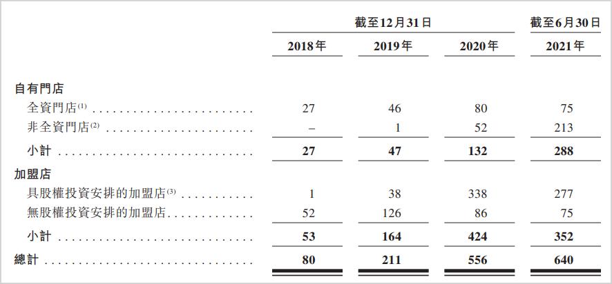 这主要包括两部分:一部分是公司自营门店中的“非全资门店”,另一部分是公司加盟店中的“有股权安排的加盟店”。招股书中称,“非全资自有门店”为公司持有超过51%股权的自有门店,“有股权安排的加盟店”为公司持有少数股份的加盟店。