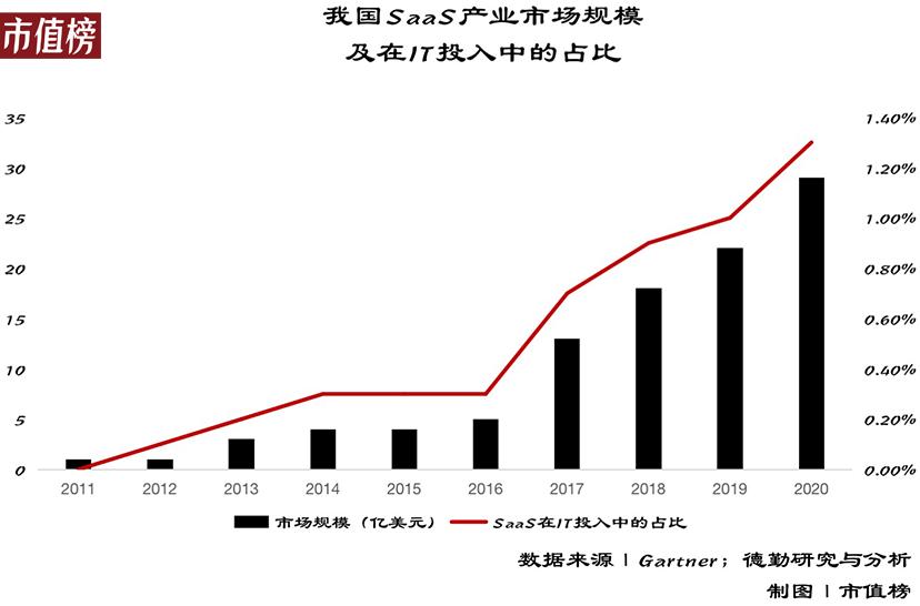 第一,我国SaaS市场规模尽管在过去几年保持着年均50%以上的增速,但2020年的市场规模仅为29亿美元;