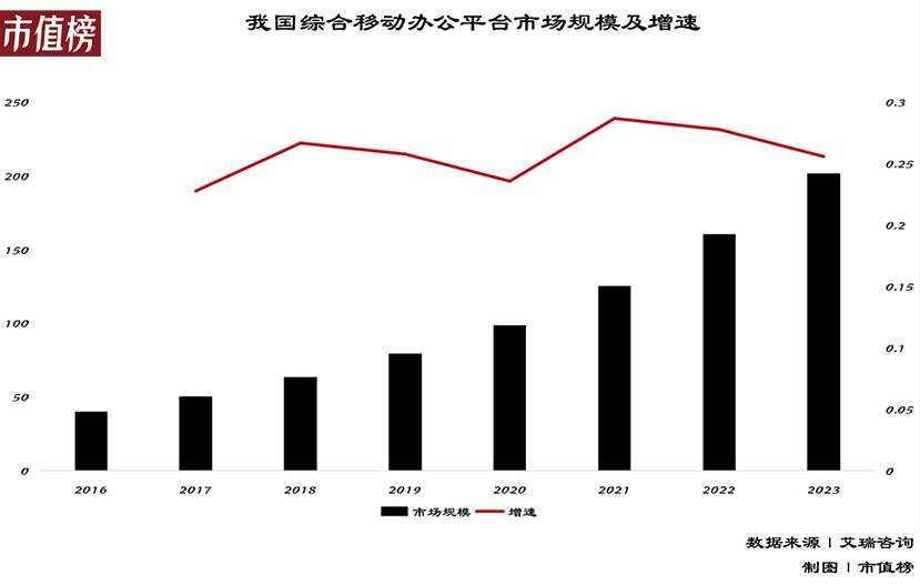 艾瑞咨询数据显示,我国综合移动办公平台市场规模,未来将以年复合增长率26.6%的增速增长,预计到2023年约为201亿元。