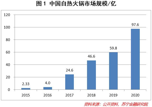 自热火锅以其新潮、便利等优势备受消费者欢迎。近五年来,市场规模出现井喷式增长(见图1),复合增长率为111%。随着疫情的发生,满足社交隔离、又能饱腹的方便类食品更是受到宅家一族的追捧,自热火锅成为超市里的“断货王”,2020年市场规模接近100亿。