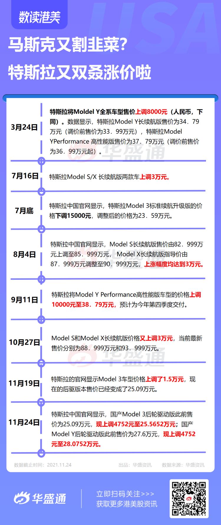 11月24日,特斯拉国产Model 3/Y均涨价4752元。国产Model 3后轮驱动版此前售价为25.09万元,现上调4752元至25.5652万元;国产Model Y后轮驱动版此前售价为27.6万元,现上调4752元至28.0752万元。