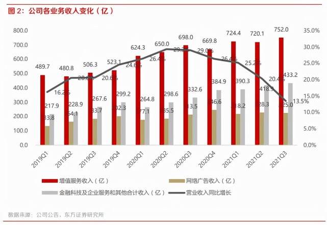 此前腾讯发布了2021年三季报,数据显示公司营收同比增长13.5%至1423.7亿元,归母净利润(IFRS)录得395亿元同比增长2.5%。三大业务板块中,增值服务同比增7.7%至752亿元,网络广告业务同比增5.4%至225亿元,金融科技与企业服务同比增长30.3%至433亿元。