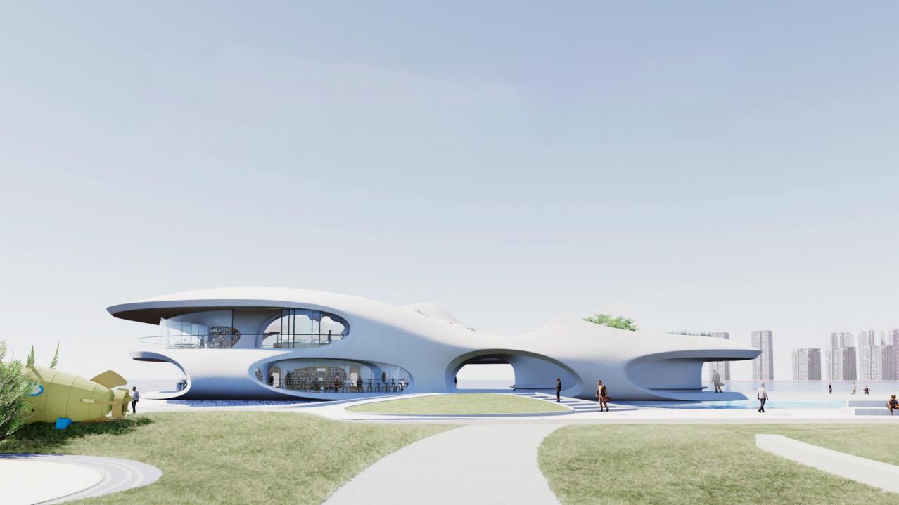 建筑北侧则是咖啡厅、开放式滨海休憩空间、公共及无障碍卫生间等24小时独立开放的配套服务设施。馆外草坪占地面积为4800㎡,与云洞共同构筑起了包括图书馆、景观台、露天表演等多个功能场所。除了日常阅读之外,观海、休憩、展会、演出......关于未来的想象都将在这个多维的时空隧道里成为可能。