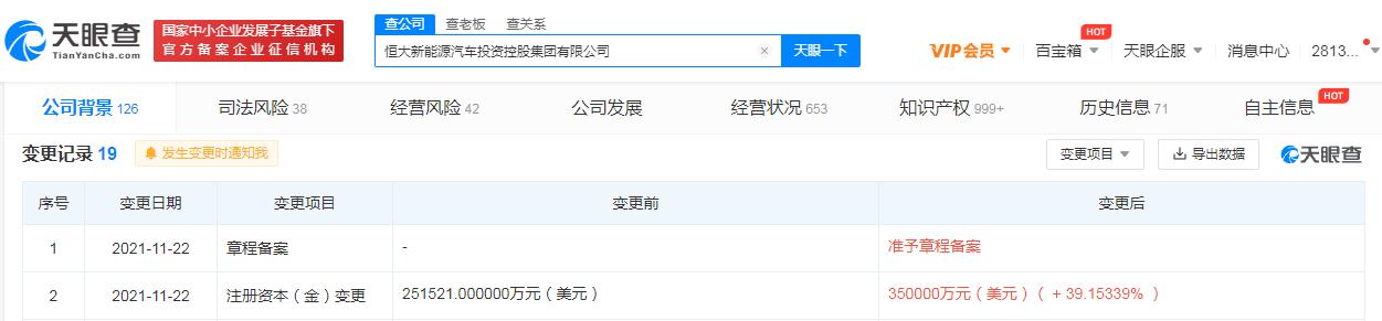 36氪获悉,天眼查App显示,近日,恒大新能源汽车投资控股集团有限公司发生工商变更,注册资本由约25.15亿美元增至35亿美元,增幅约39%。该公司成立于2019年1月,经营范围含在国家允许外商投资的领域依法进行投资(限外商投资企业)。股权穿透图显示,该公司由恒大新能源汽车控股(香港)有限公司间接全资控股。