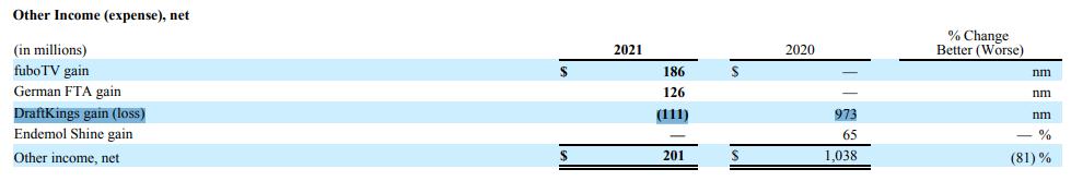 2021财年,迪士尼在DraftKings的投资带来亏损1.11亿美元,上一年是盈利9.73亿美元。