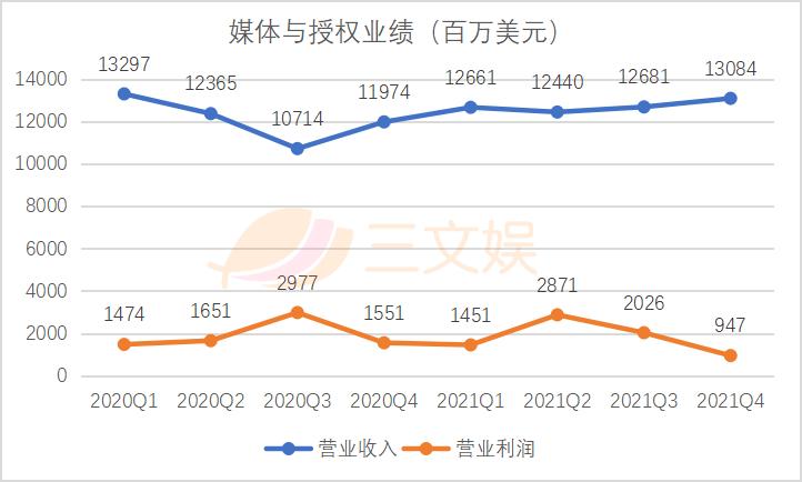 迪士尼的内容发行与授权业务的颓势最为明显。全年营收73.46亿美元,同比去年下降33%,营业利润仅5.67亿美元,同比下滑51%;第四季度单季该业务直接亏损6500万美元。
