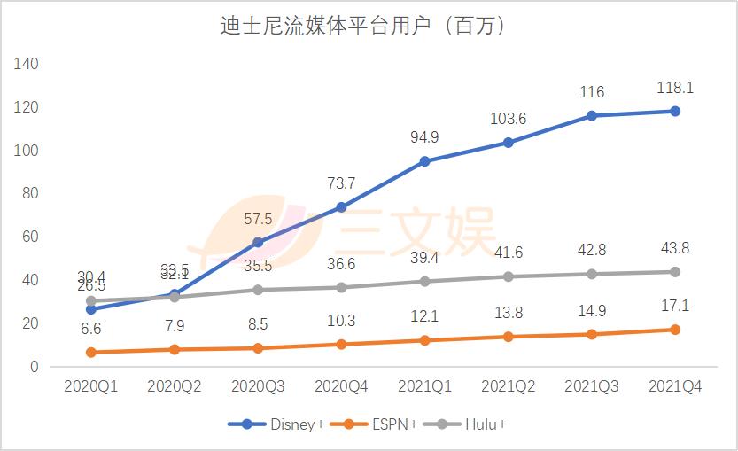 体育垂类流媒体平台ESPN+的订阅用户数在2021财年也取得不错的增长——66%,甚至略高于Disney+的增长幅度。