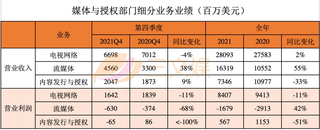 2021财年,流媒体全年营收163.19亿美元,同比增长55%;营业利润亏损16.79亿美元,相比去年亏损收窄42%。这表明,流媒体业务的确有所增长,但仍然处于烧钱的阶段。