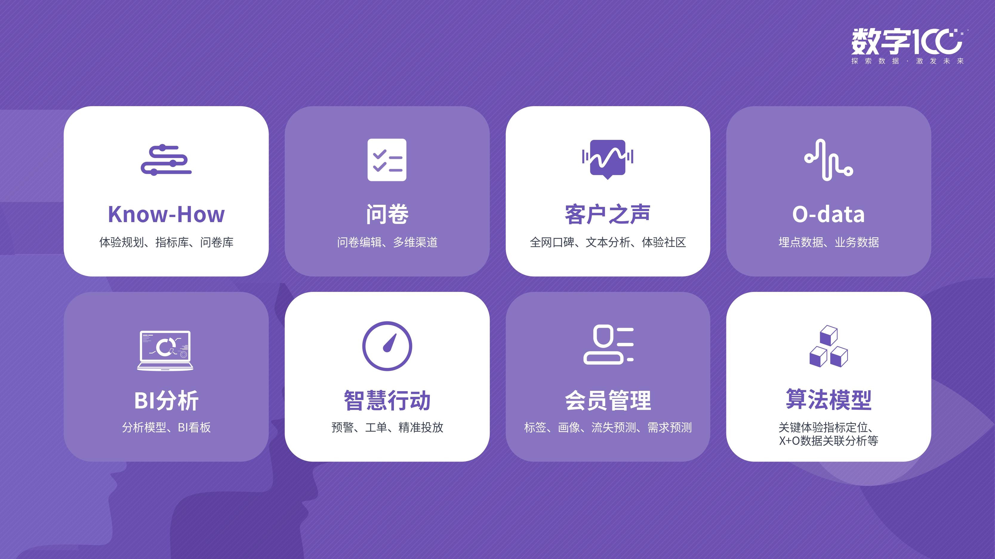 以数字100为例,这家有着10年以上行业经验的数据智能企业,早年以数据采集、调研为主要业务,例如,为企业提供问卷调查、用户调研等服务。面对不断变化的企业需求,数字100在近年开始整合自己的产品线,并推出了覆盖全业务流程的CEM平台“体验宝CEMPRO”。
