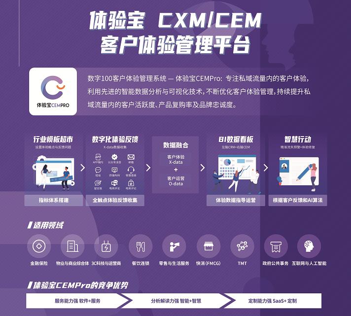 以企业服务商“数字100”旗下的CEM平台“体验宝CEMPRO”为例,其打通了企业组织内部运营、营销、产品、客服、销售等部门的数据及目标,并可通过问卷、调研、社交媒体等渠道收集用户体验信息,并通过算法为体验管理人员提供体验提升、运营提升等智能分析决策,帮助品牌管理、提升客户体验。