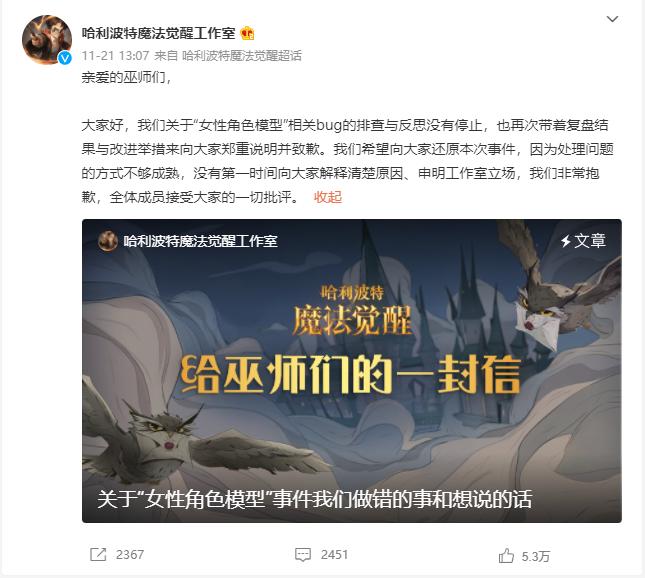 事发后的第二天中午,哈利波特魔法觉醒工作室表示已修复了BUG,再次致歉,并发放了相应的修复补偿。11月16日,哈利波特魔法觉醒工作室再次发布致歉信长文,对女性巫师模型问题进行更进一步的阐述,“我们也再次向玩家们诚恳致歉!感谢玩家们一直以来对我们游戏的监督与支持。”