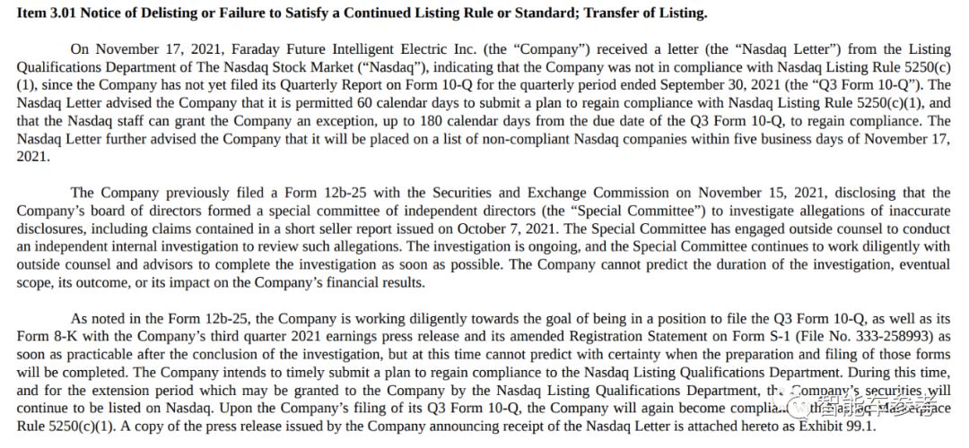 警示函称,由于FF没有在规定期限内提交第三季度财报,被列为不符合规定的上市公司。