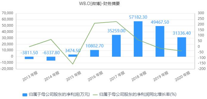 在核心指标的增速上,微博的成长性也不复当年。其2020年营收录得负增长,归属于股东的净利润更是在2019年和2020年连续两年负增长。