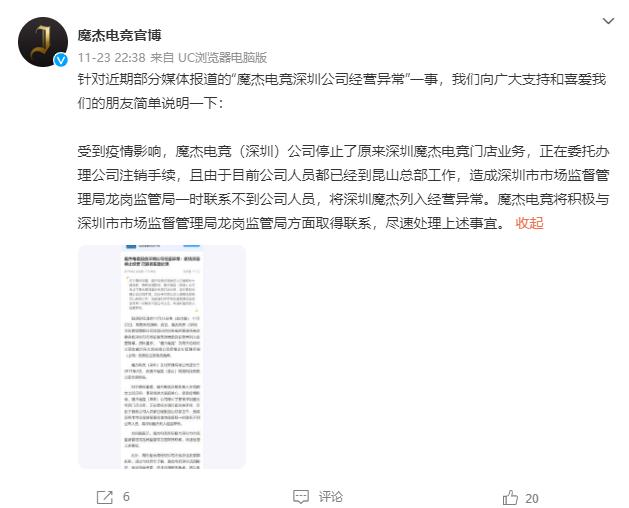随后魔杰电竞在微博发布了一则澄清声明表示:魔杰电竞(深圳)公司停止了原来深圳魔杰电竞门店业务,正在委托办理公司注销手续,且由于目前公司人员都已经到昆山总部工作,造成深圳市市场监督管理局龙岗监管局一时联系不到公司人员,将深圳魔杰列入经营异常。魔杰电竞将积极与深圳市市场监督管理局龙岗监管局方面取得联系,尽速处理上述事宜。