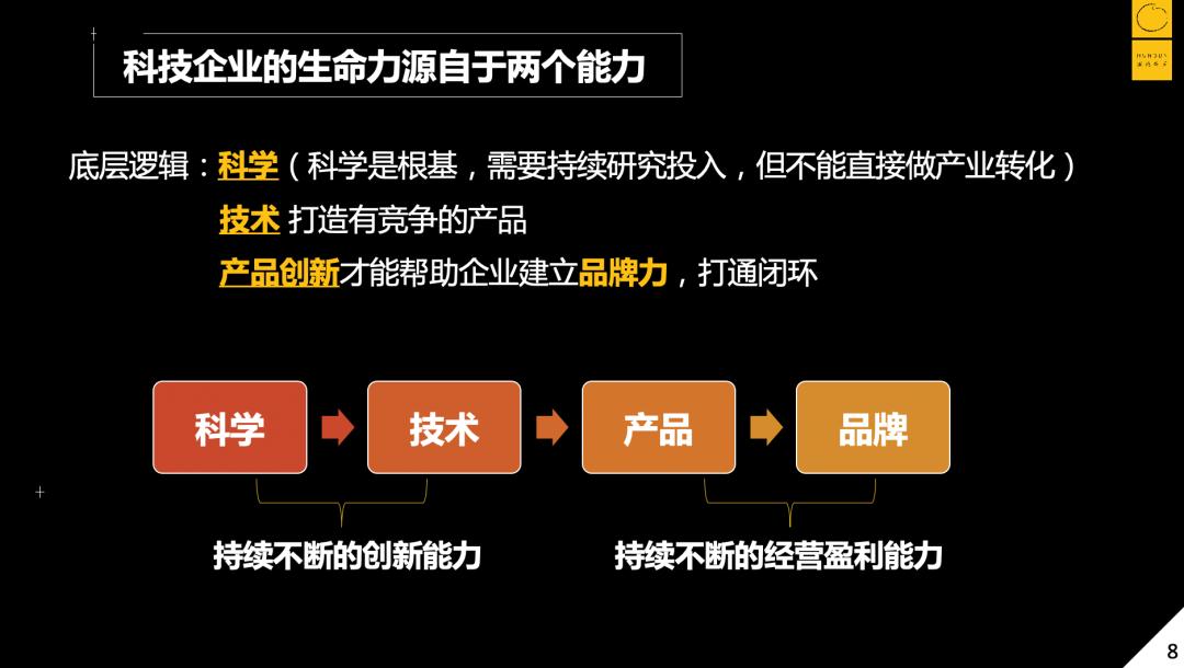 所以我们发展的底层逻辑就是从最核心的科学到技术,然后到产品,最后建立品牌。一定要形成这个闭环,否则从任何一个地方出发,都可能是空中楼阁。