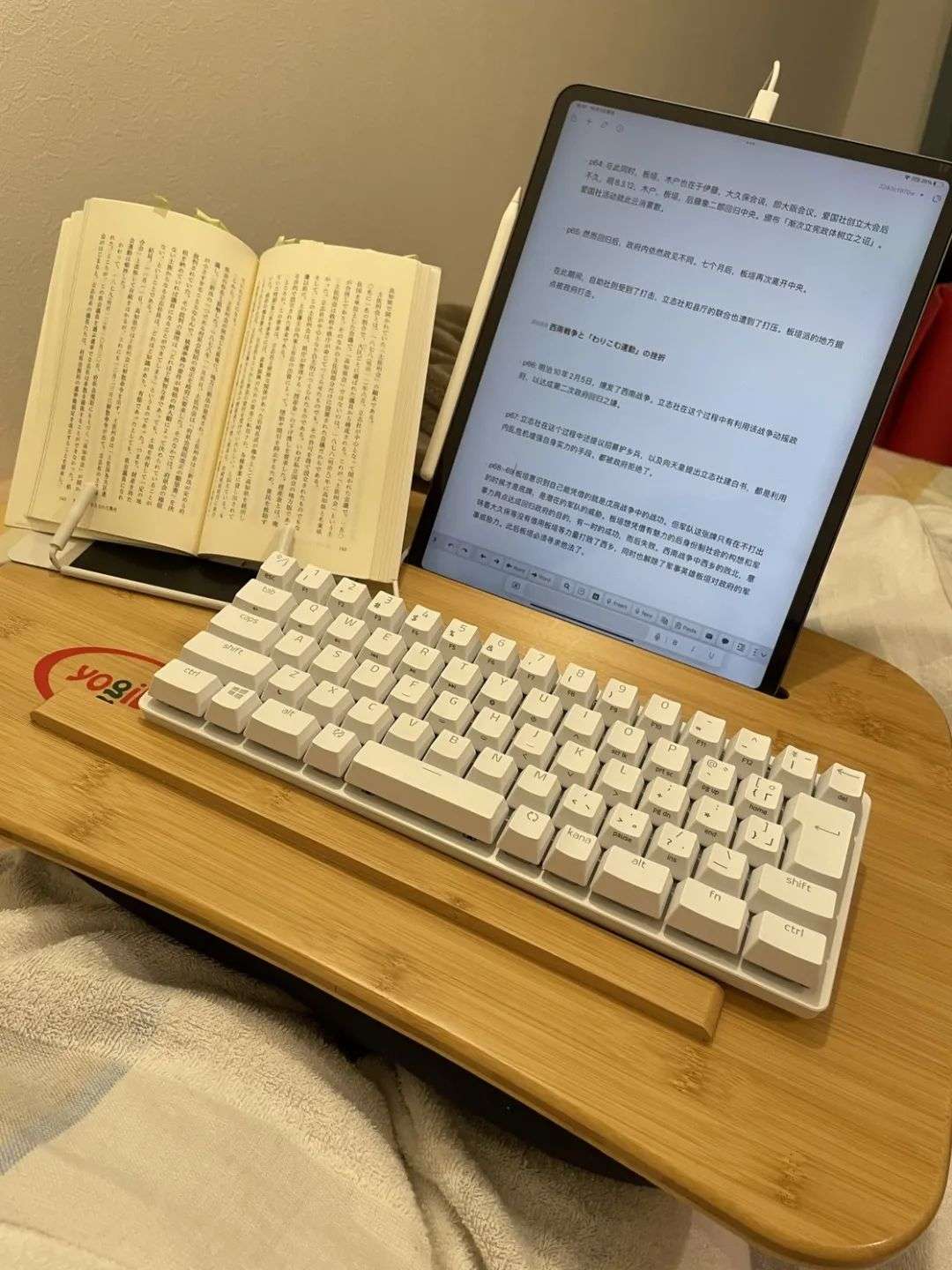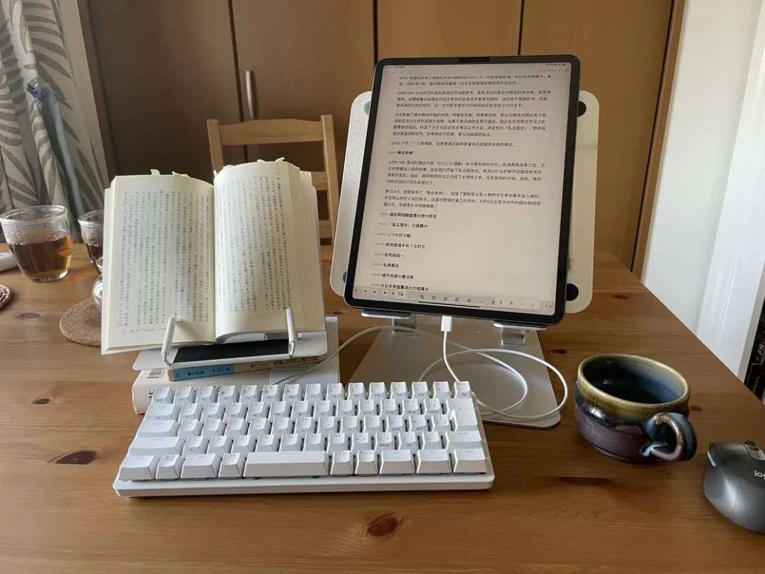 应对上述需求,书桌设置都尽量维持简洁。我喜欢电子笔记,所以要包括最低限度的书,电脑(iPad),键盘即可。如果阅读的是电子书,阅读的媒介会从纸质书换为 iPad 或者电纸书。但基本构造类似。像这样: