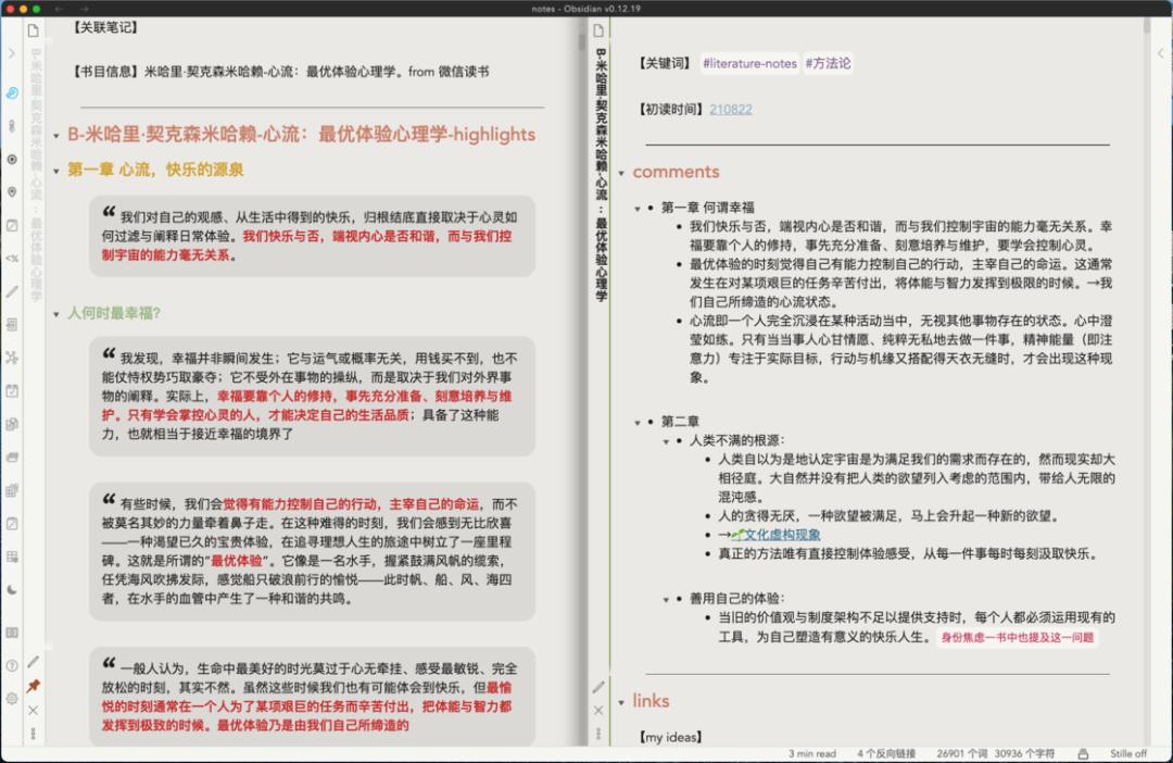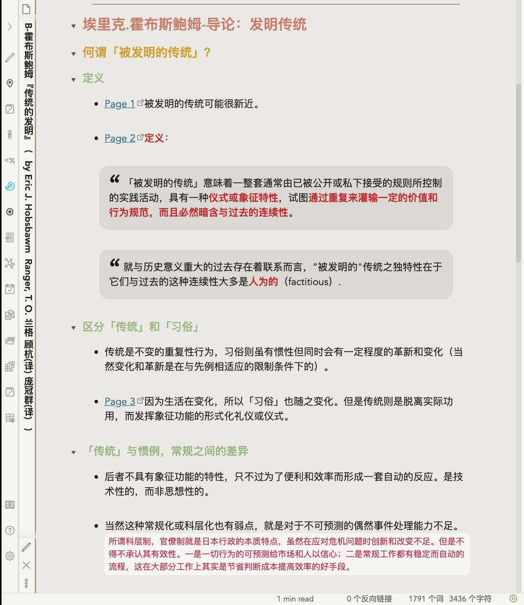 譬如卡片盒笔记法要求笔记的原子化,也即,每条笔记尽量简短,一条笔记只记录一个知识点或想法。然而我在读书做笔记时更喜欢整体性把握文章的逻辑结构,因此不喜欢把笔记作成一个个分散的知识点卡片。因此有时读书笔记会长的惊人。譬如这篇笔记有一万八千个字。