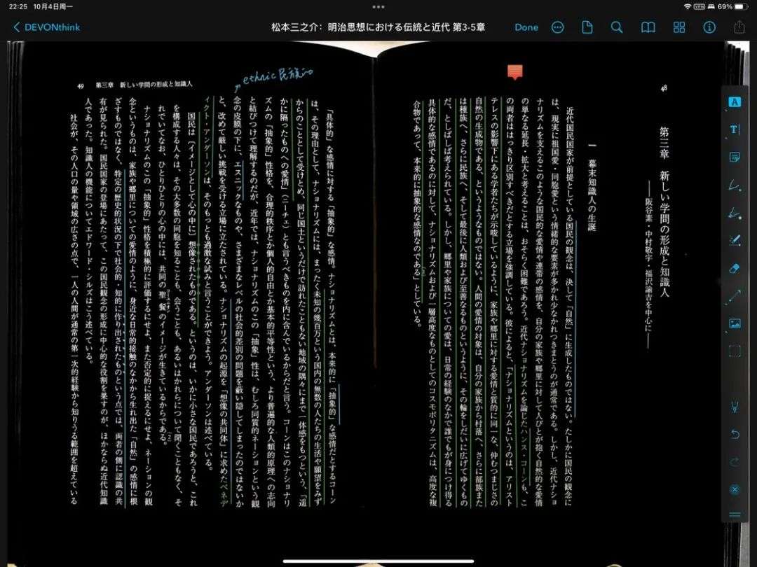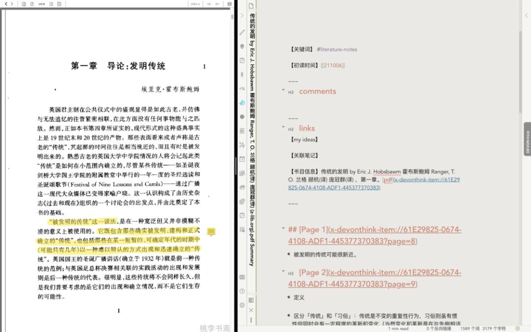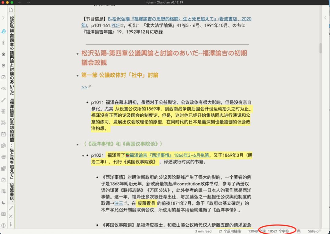 - 我读的书大多是日语文献,即使日语水平再高也不如读中文快。对于花工夫精读下来的文章,不详细记录有点可惜。而一旦记录了,意味着我今后基本上可以依靠笔记,如果需要追溯原文时,则可以通过前述的 DEVONthink 中的 Page Link 简单跳转。