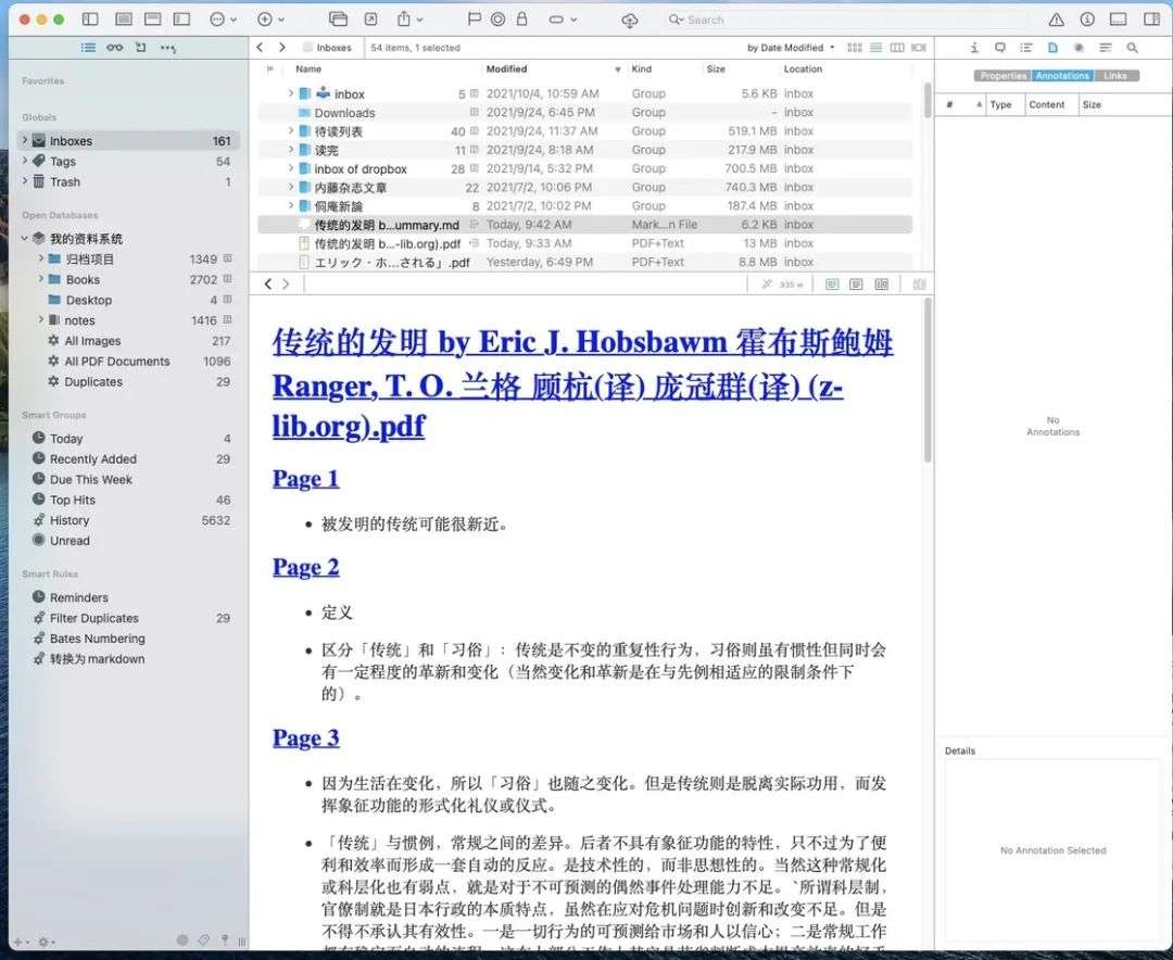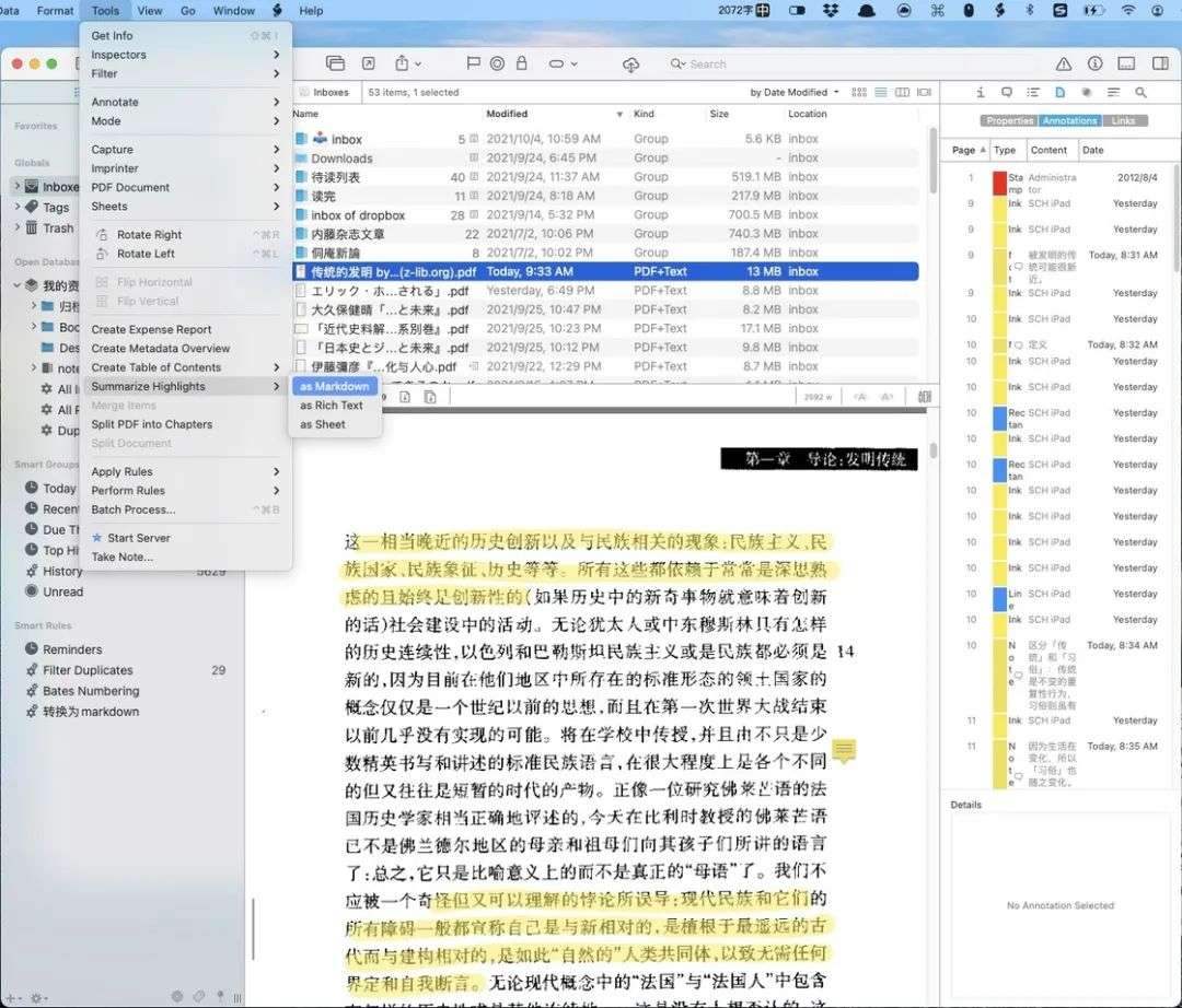 - Step 3:打开电脑,PDF 文件已经被自动同步了,在 Mac 版的 DEVONthink 中提取自己做的标注笔记为 Markdown 文件,并转移到 Obsidian 中,这时就形成了笔记初稿。具体做法是:Tools → Summarize Highlights → As Markdown。这时会形成一个新的 md 文件。可以看到,软件自动形成页码和链接。将它发送到 Obsidian 中即可。