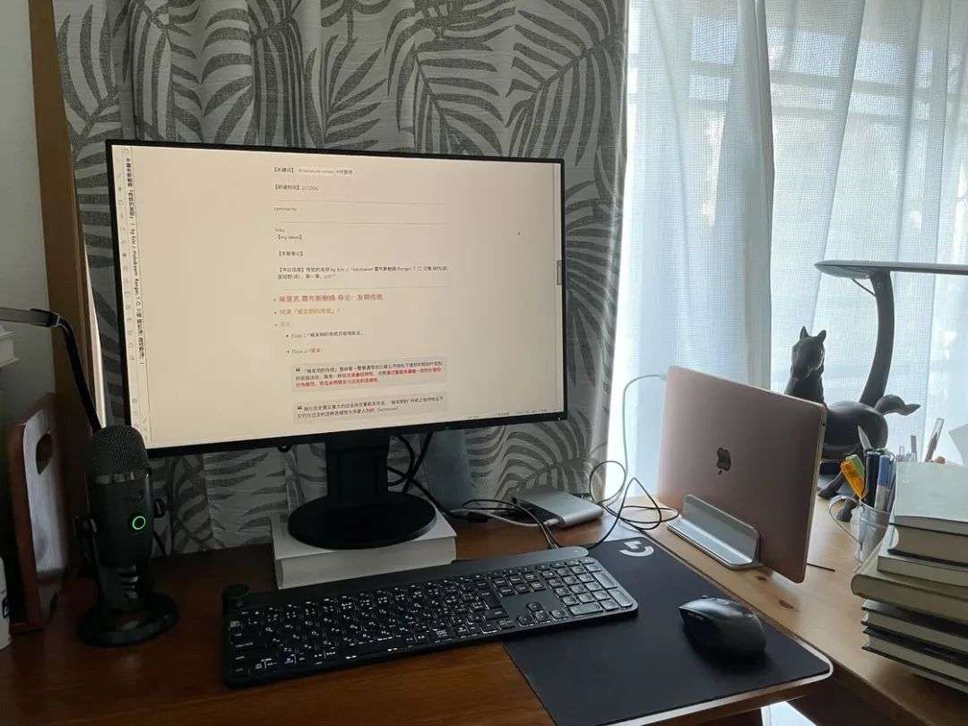 书桌三则是正式的工作台。这是为了方便整理笔记、复习笔记的阶段。这一阶段需要进行大量的编辑工作,还是在电脑、显示屏、全键盘乃至话筒的加持下才更加高效。