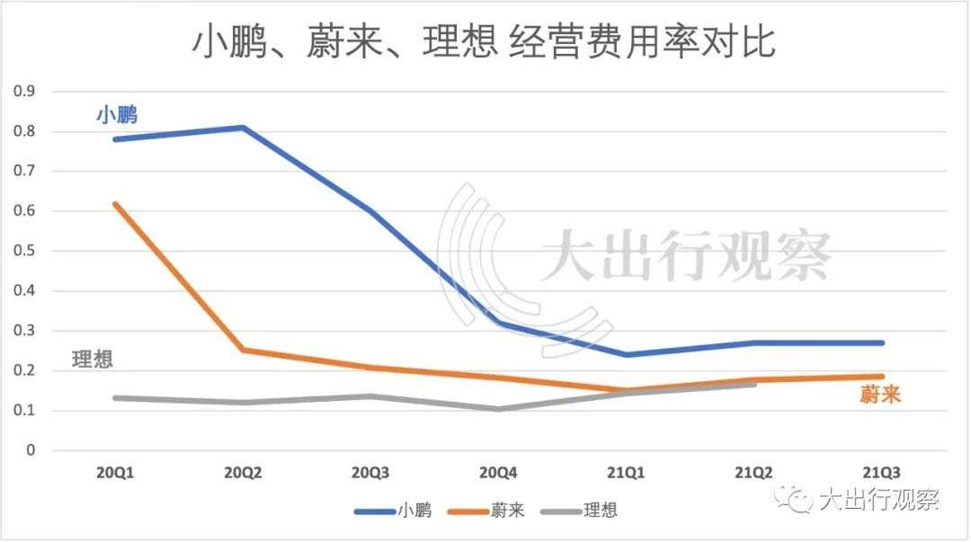 “大出行观察”整理小鹏、蔚来、理想三家新势力造车企业的营销费用率发现,前三季度,小鹏汽车营销费用率为0.26,是蔚来的1.5倍多。