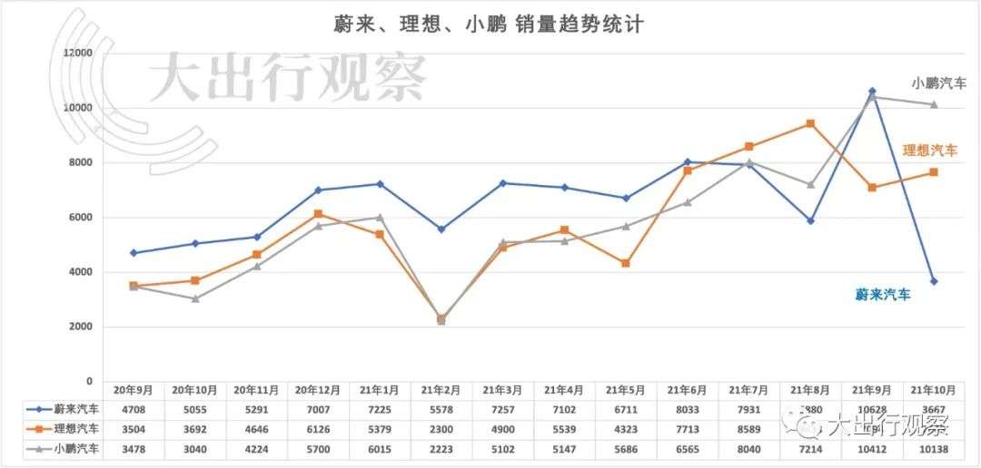 要等到10月,蔚来遭芯片危机,车辆延迟交付,小鹏才以10138辆的交付量首次超越蔚来、理想,当月交付夺冠。但这一销量数字也比9月下降2.63%。