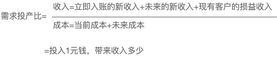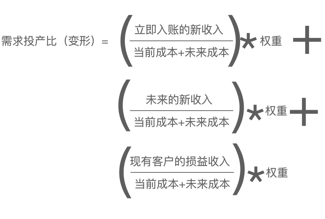 需求投产比=【立即入帐的新收入/(当前成本+未来成本)】*权重+【未来的新收入/(当前成本+未来成本)】*权重+【现有客户的损益收入/(当前成本+未来成本)】*权重