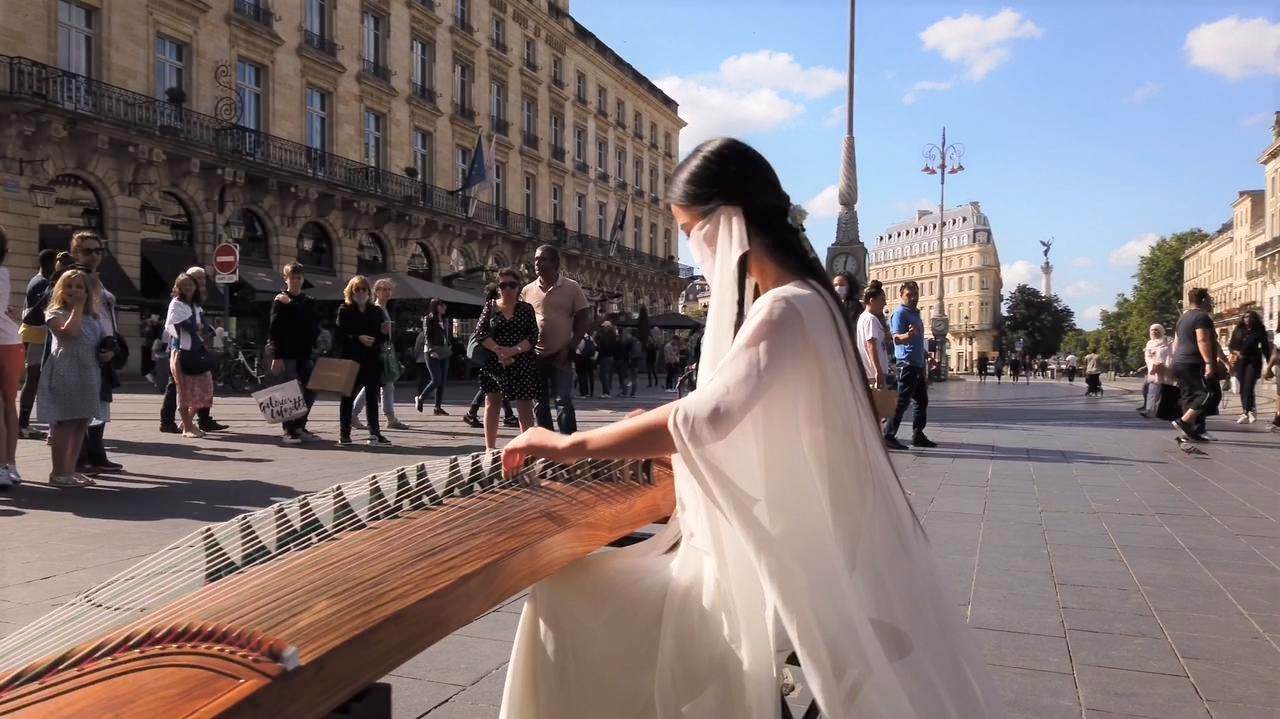法国波尔多市加隆河畔,路人匆匆,却因为一阵悠扬音乐声的响起,不约而同地停留驻足。寻觅源头,原来是一位中国女孩,伴一架古筝,着一袭汉服,披一副面纱,动人的音符从她舞动的指尖流淌出来,为充满欧式风情的老城街头带来了迥乎不同的东方美。