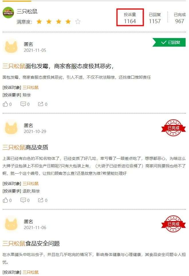 黑猫投诉平台上,关于三只松鼠的投诉量一共有1164条,发霉、有虫子、有虫卵等问题比比皆是。