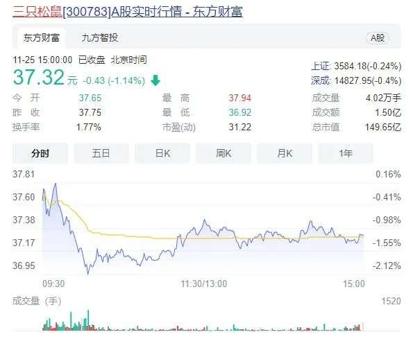 截至2021年11月23日,三只松鼠收盘价仅为37.3元/股,较之高峰时期的91.59元/股,近乎“腰斩”。