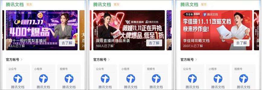 产品在官方的推动下,又迎来了新形式的“出圈”。在刚刚过去的“双十一”购物节中,顶流带货主播李佳琦、薇娅和雪梨都用了腾讯文档来做推广。文档对于商品的分类十分细致,还标注了品牌、价格、赠品及优惠券等信息。虽然信息整合得很全面,也有一定的便捷性,在线文档却就此被简化为一个“能够在线查看的文档”,全然失去了“多人在线协作”的产品特性。