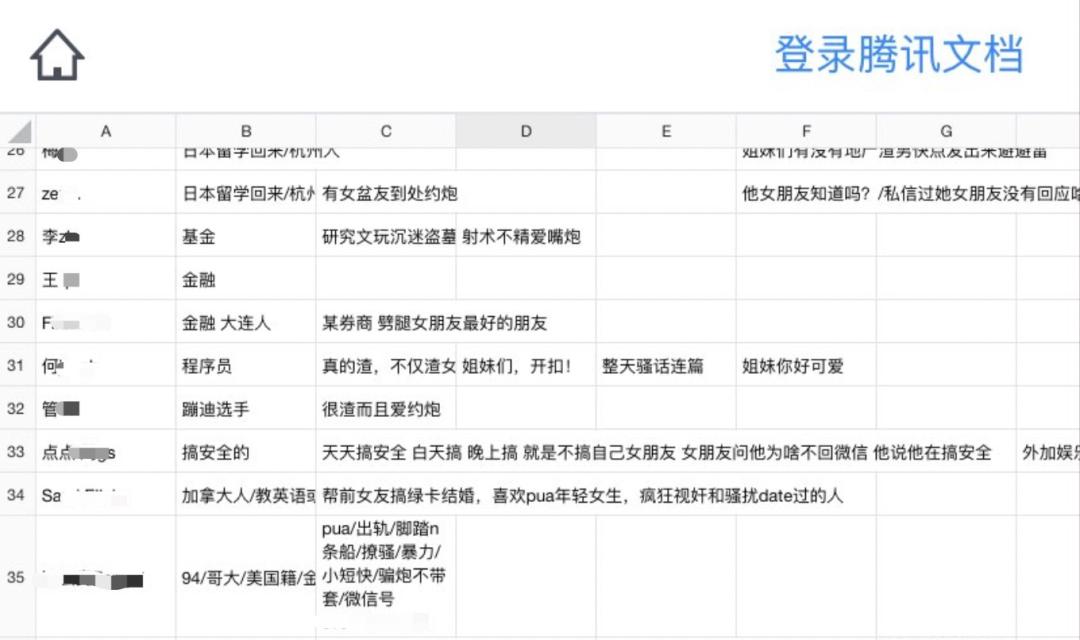 为了方便更多人填写,很多文档创建者会把权限设置为“所有人可查看和编辑”,但这样一来也就意味着信息有了被随意查看甚至篡改的风险。在文档《 Tinder 渣男避雷》中还充满了各种无厘头式的对“渣男”的评点和吐槽。那些“骗婚”、“骗钱”与“骗炮”的明显违反主流道德标准的暂且不表,就连“发微信不回”也被纳入了“渣男”范畴。