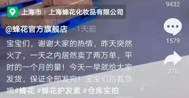 闻讯而来的消费者,因为心疼蜂花再度上演了野性消费的戏码,冲进蜂花直播间一天买了2万单,差不多等于蜂花平常一个月的销量。