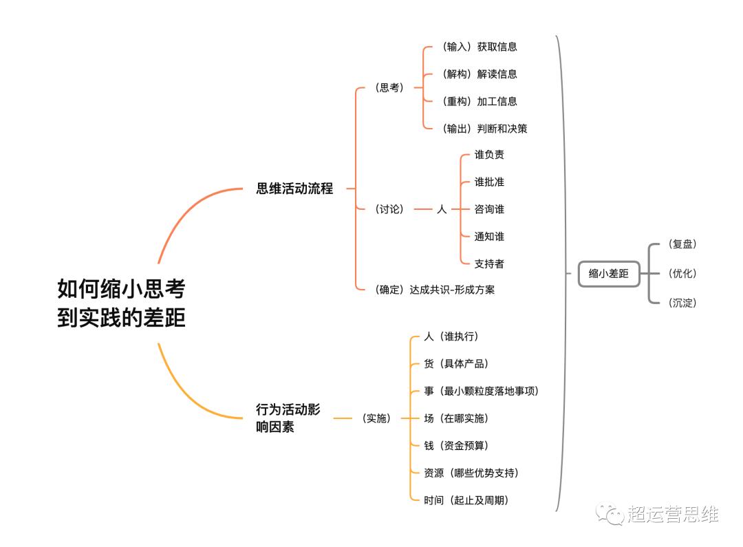 这里我们采用结构化的思维来拆解这个思路,并且把思考过程呈现出来。前面提到方案到落地结果差异本质上是由思考到实践出现了偏差,那我们要缩小或者解决这两者之间的差距,就得从思考和实践两个方面来思考,也可以理解为思维活动和行为活动两个方面: