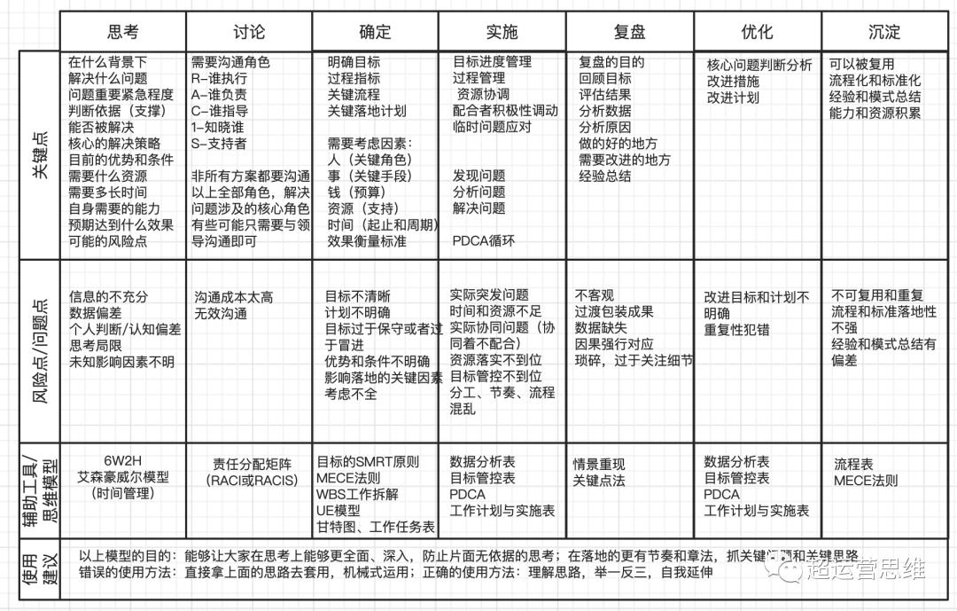 围绕以上拆解思路,我们确定出思考到实践的几个关键流程节点,并给出对应的关键点、风险点/问题点和思考模型及工具。辅助我们运营工作中的思考和落地实践,具体如下: