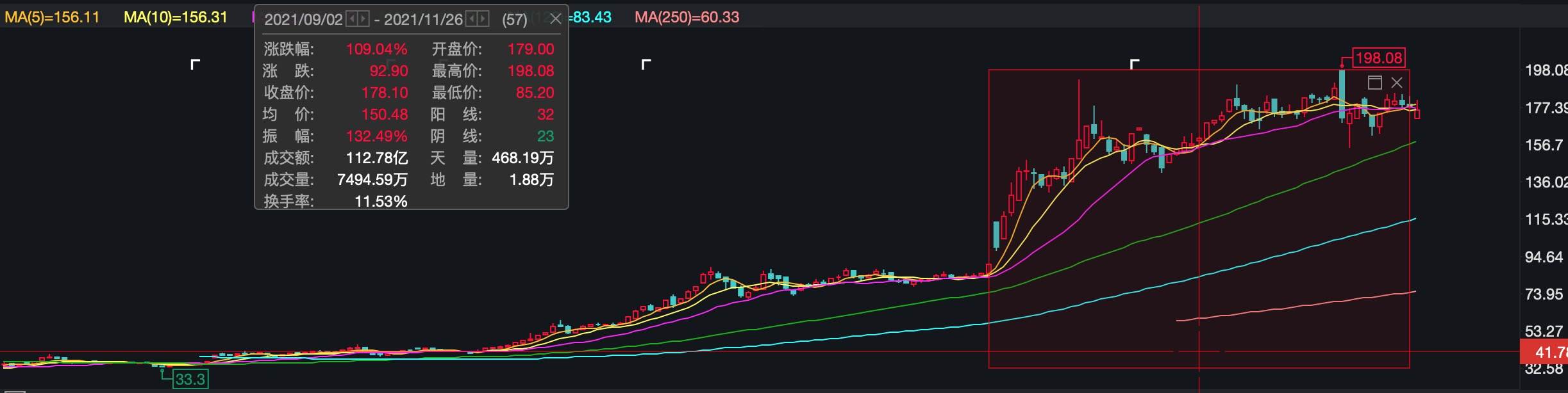 自9月2日习总书记宣布设立北交所以来,截止到2021年11月28日,贝特瑞股价从85元附近一路上涨至178元左右,不到三个月的时间累计涨幅已经超过109%。在股价一路飙升的推动下,贝特瑞的市值达到了864亿元,成为名副其实的“北交所一哥”。