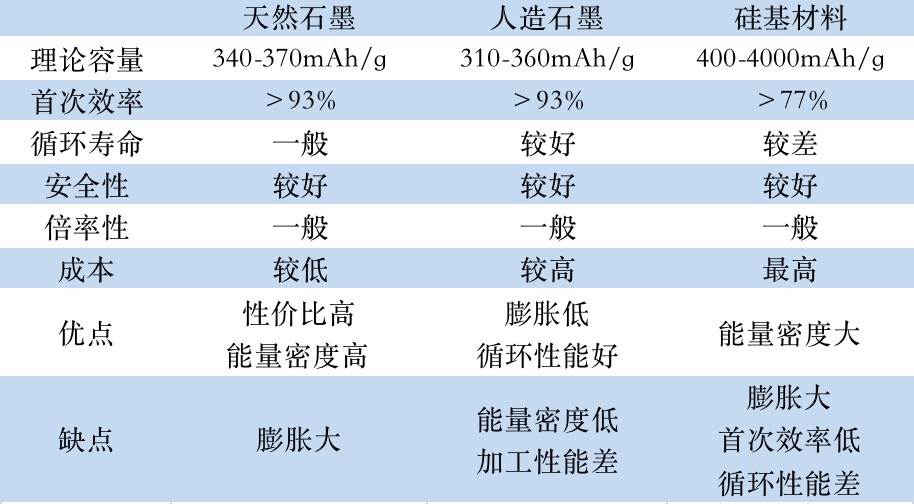 图8:负极主要材料特性对比 数据来源:高工锂电、36氪整理