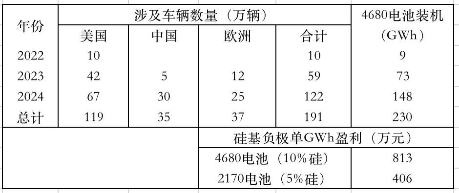 如果以上假设成立,那么2022全年将会有10万辆Model Y(美版长续航版本)使用4680电池,对应装机量9GWh;2023年进入大规模放量期,预计国内+美国+欧洲共有59万辆车型使用4680电池,对应装机量为73GWh;20204年完成对2170的全面替代(Model 3除外),国内+美国+欧洲合计122万辆车,对应装机量148GWh,综合来看,2022-2024年4680电池的预计装机量在230GWh左右。