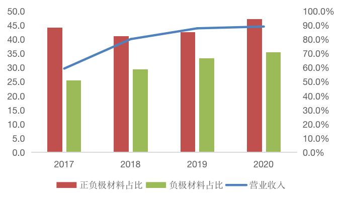 2017-2020年,公司主营业务收入为 29.7亿、40.1亿、43.9亿和44.5亿,正极和负极收入合计占比分别为88.4%、82.2%、85.1%和94.2%。其中,负极材料的收入占比为50.9%、58.8%、66.7%和 70.8%,是公司最主要的收入来源。