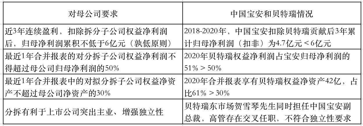 贝特瑞是A股上市公司中国宝安的子公司,中国宝安通过直接和间接方式共持有贝特瑞68.36%的股份,对公司拥有最高权益和表决权。作为中国宝安的核心资产之一,贝特瑞为其贡献了主要的利润来源,也正因如此,如下表所示,使得贝特瑞不能满足《上市公司分拆所属子公司境内上市试点若干规定》(2019 年 12 月 12 日)中的几个硬性条件,丧失了直接在上证和深市场上市的机会。