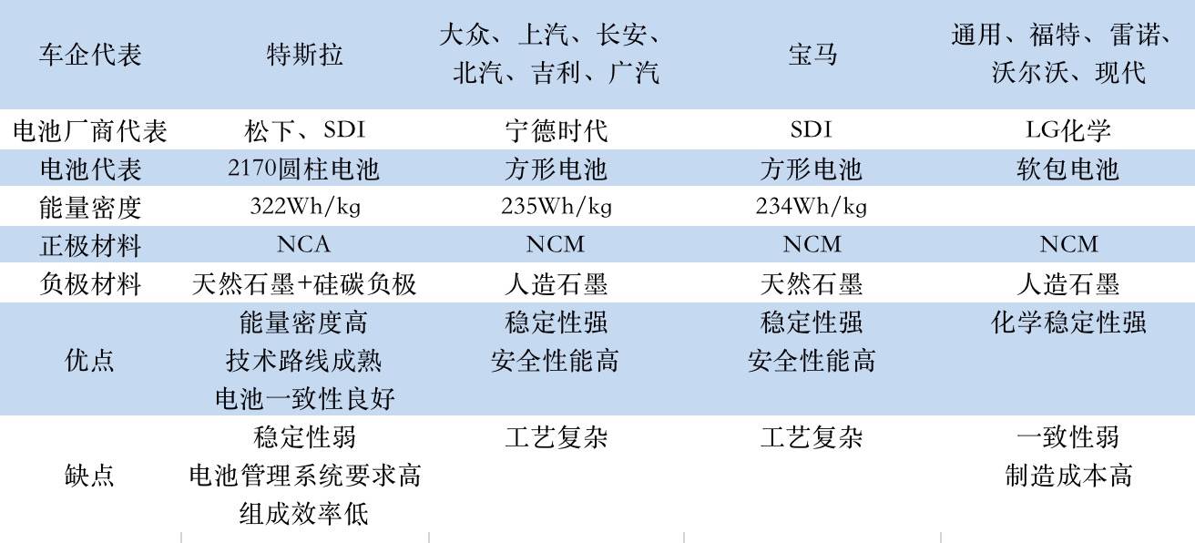 图5:市场主流车企和电池厂技术路线对比 数据来源:申万宏源、36氪整理