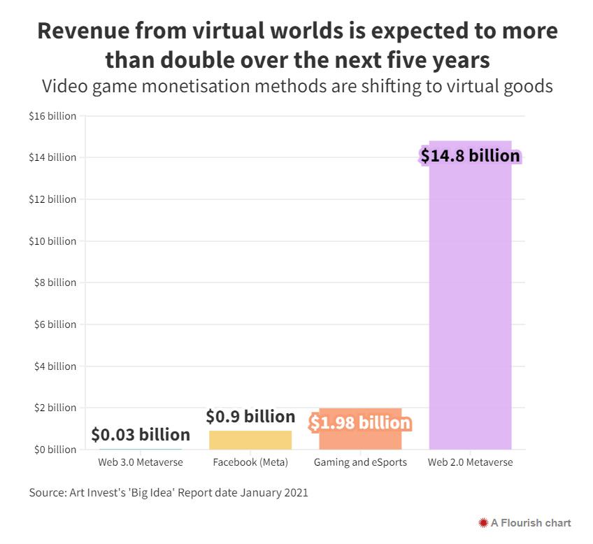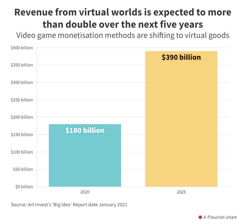 这些科技巨头认为与其被其他参与者打乱市场计划,不如利用用户打发空闲时间的方式的转变来改变自己的计划。千禧一代及其后几代人会花更少的时间看电视,却更喜欢社交媒体和电子游戏。 根据Ark Invest的估计,随着社交生活和游戏的融合,虚拟游戏世界的收入预计将在2025年增长到4000亿美元 。