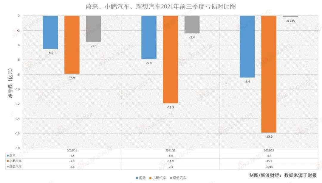 2、Q3季度,三家依然在亏损。不同的是,蔚来和理想汽车都实现了减亏,而小鹏汽车亏损在持续扩大,但其毛利率最低。