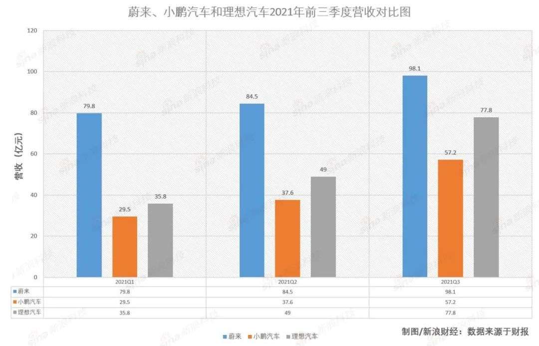2021年第三季度,三家造车新势力依然处于亏损中。在营收上,蔚来、小鹏汽车和理想汽车分别为98.1亿元、57.2亿元和77.8亿元。亏损分别为8.4亿元、15.9亿元和0.215亿元。