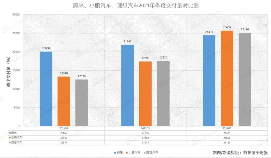 2021年第三季度,蔚来的交付量在三家中已经开始落后。今年前三个季度,蔚来的季度交付量分别是20060辆、21896辆和24439辆。