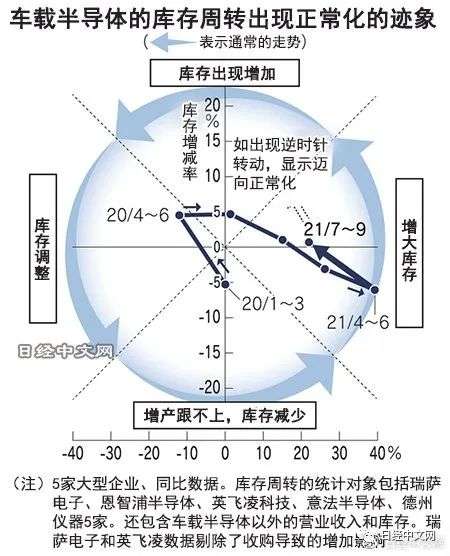 日本经济新闻(中文版:日经中文网)以5家车载半导体厂商的期末库存(存货)的增减率为纵轴、以营业收入的增减率为横轴,绘制了库存周转图。