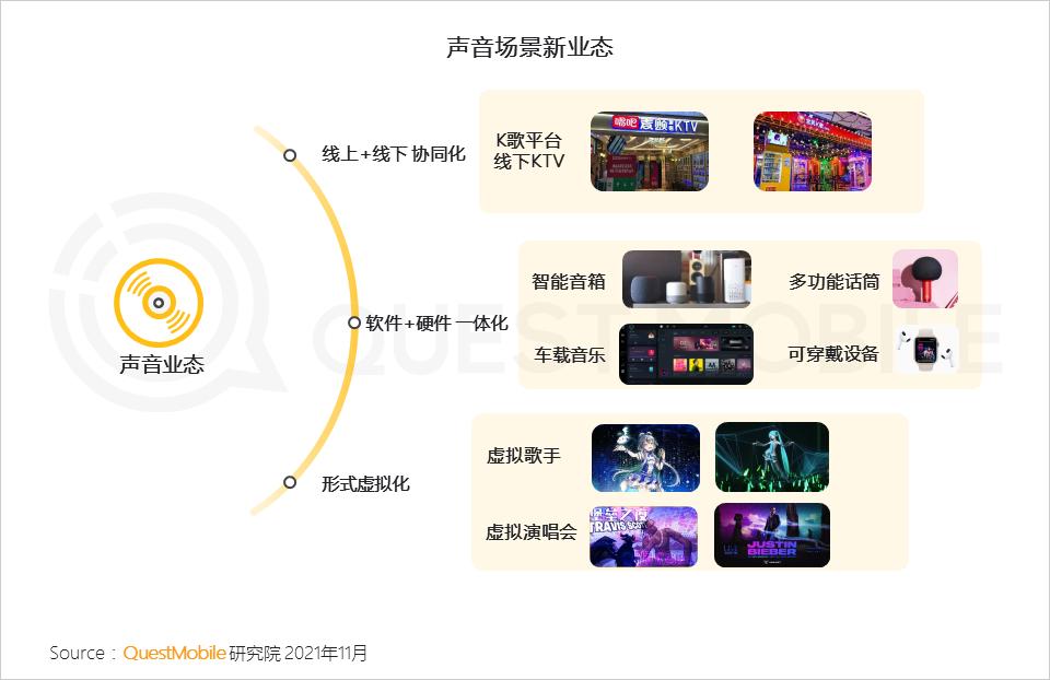 围绕声音平台的产业链也在快速发展,一方面,音乐达人、配音达人、转述师、音频播客等,产出了不同细分用户需求的内容,例如知识服务、K歌、音乐社区等,都有不同活跃人群参与;另一方面,线上+线下(K歌平台+KTV等)、软硬件一体(智能音箱、穿戴设备等)、虚拟现实(虚拟歌手、虚拟演唱会)等等产业链新形态也在大量出现,由此也产生了全新的应用场景和商业模式……