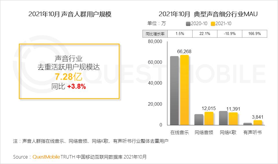 2、声音人群规模已突破7亿,同比增长3.8%,其中,行业发展较为成熟的在线音乐行业优势明显,新兴发展的有声听书行业增长强劲