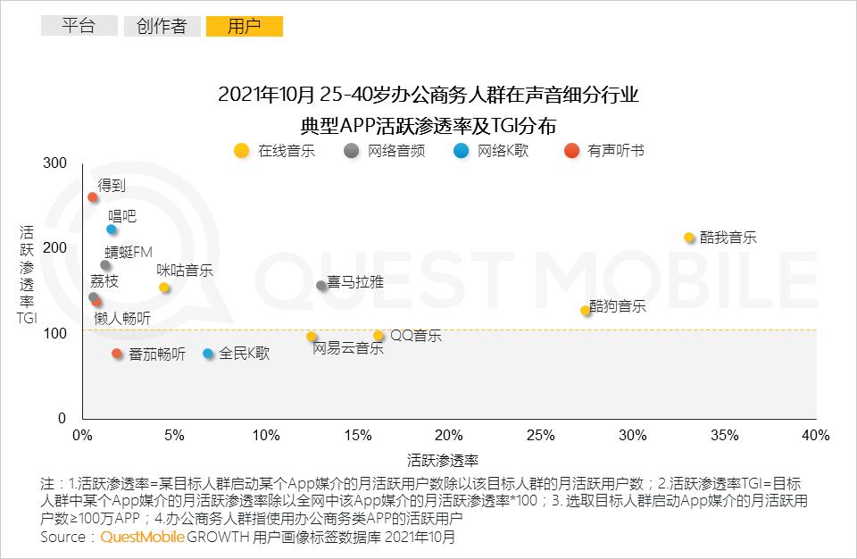 5、职场用户对于多元化音频内容接受度较高,尤其在有声听书领域,提供知识服务类音频应用深受职场用户的偏爱,与此同时,可深度参与的K歌类应用亦收获该人群的喜爱