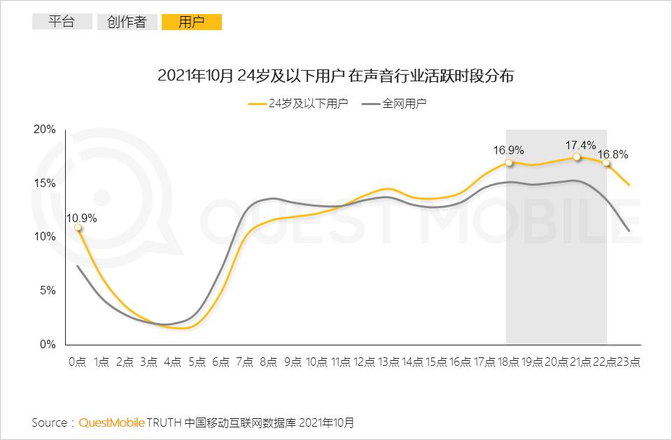 4、相较于全网用户,24岁及以下年轻用户的娱乐活动从午后开启,对于声音内容活跃高峰时段集中在18点至22点,深夜零点仍有超一成用户与声音为伴